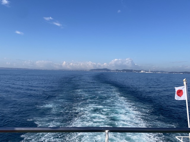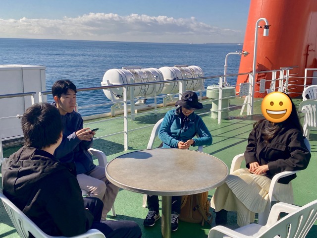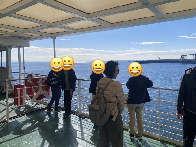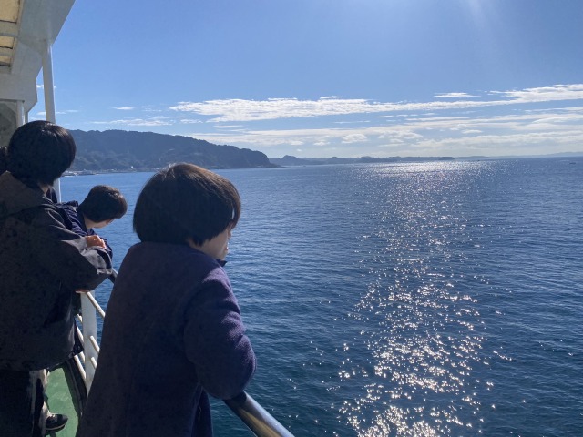 天気はとても良く、海の青さがまぶしいほど。景色を写真に撮る生徒もいれば、船酔いでぐったりしている生徒もいて、それぞれの表情から旅の始まりを感じました。