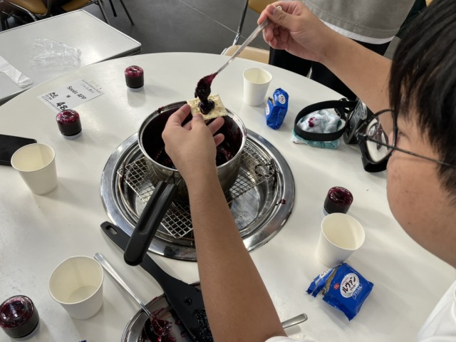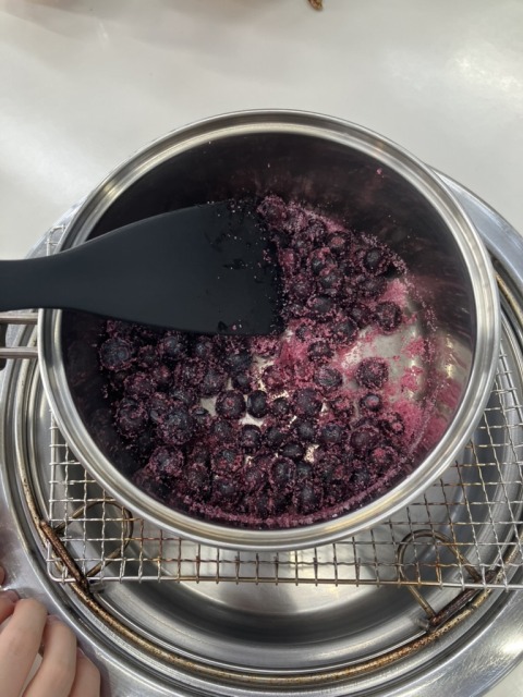 ブルーベリーを炒めて砂糖を加えると、すぐに甘い香りが広がり、手作りジャムの完成。